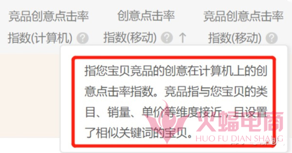 如果你的产品是以移动端为主的,计算机的指标可以不看,我们只看移动端数据,其中创意点击率指数指的是我们的产品按照系统核定的点击率指数化后的点击率数据,通俗点说,是个指数化后的点击率(又来指数化,阿里真是黔驴技穷啊),看到指数化,我就要给大家一个提醒,千万不要按比例来估算数据,比如我们的点击率指数是5%,竞品是10%,不代表竞品真实点击率就是我们的两倍,指数化数据跟真实数据的关系一般都不是线性函数。另外就是竞品创意点击率指数,这个数据,跟前面那个最有创意是无关的,是我们自己类目的竞品的综合数据,我们截图看一下官方说明。