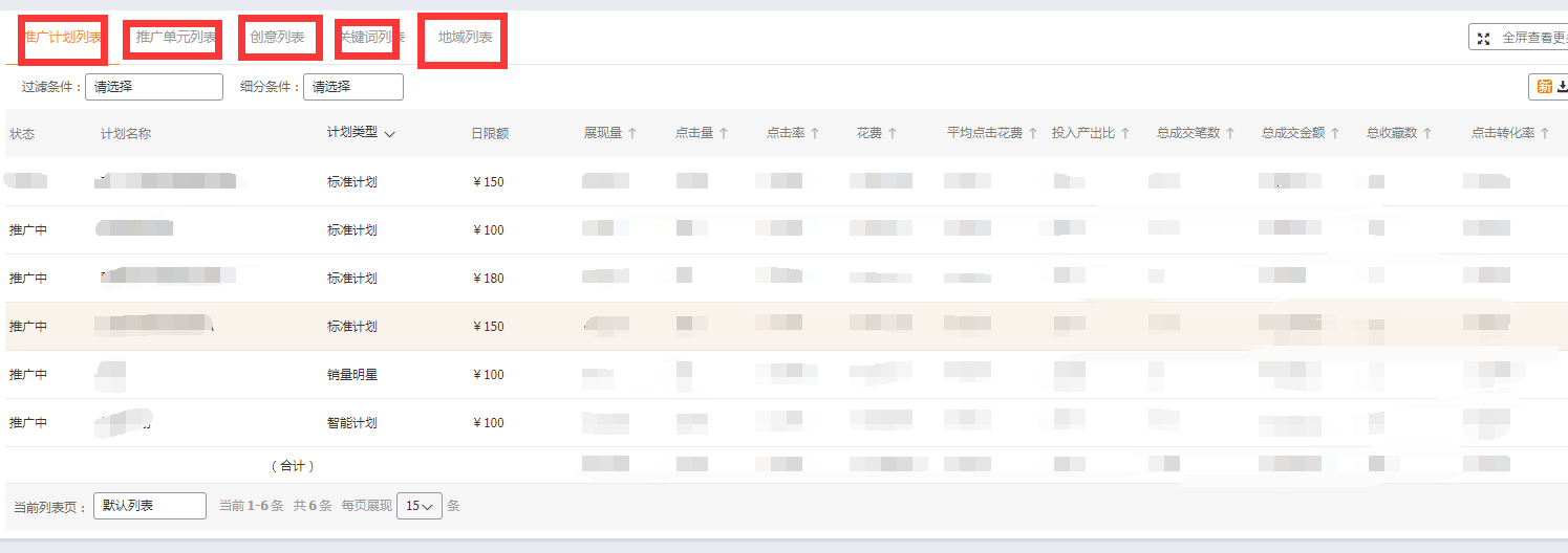 报表里面展现的就是、推广单元、推广计划、创意列表、关键词列表、计划列表,我们可以查看这里的所有数据,观察直通车的数。