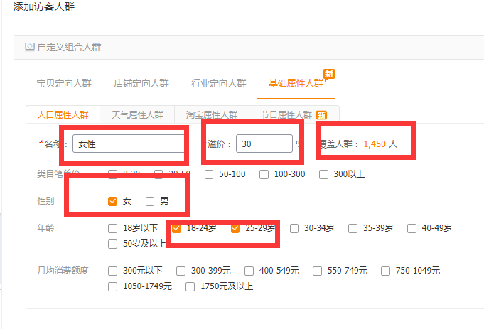 根据我们宝贝额类目笔单价、性别、年龄、月消费额度来的。